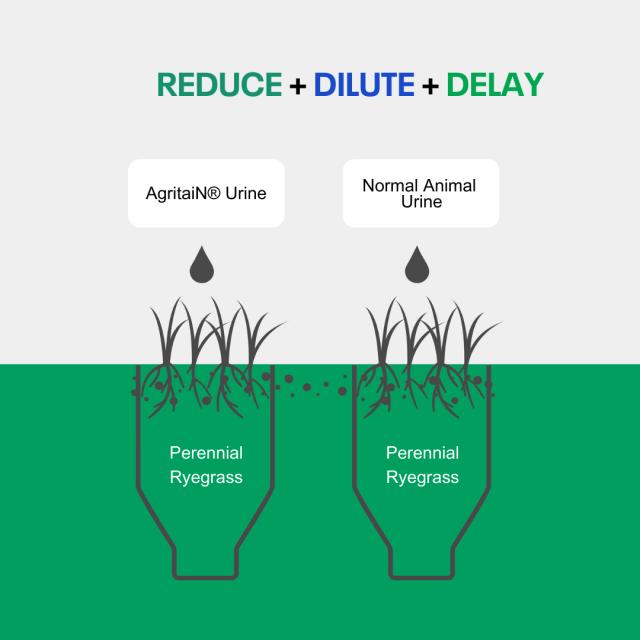 Delay: In urine patches from animals grazing AgritaiN®, the conversion from ammonium to nitrate is delayed. Slower conversion allows plants a greater opportunity to uptake nitrogen, significantly reducing the potential for leaching.