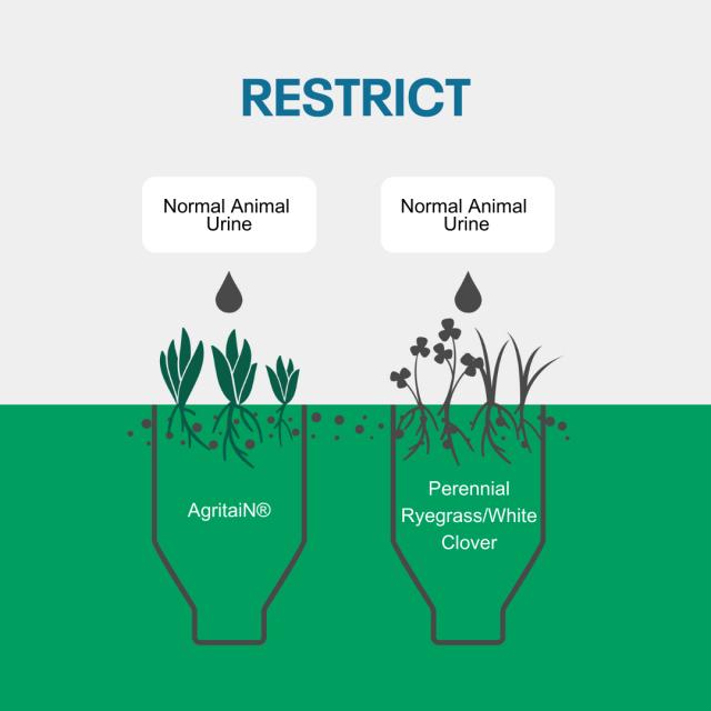 Reduce: AgritaiN® reduces the amount of dietary nitrogen which is excreted in urine, compared with ryegrass. This reduces the amount of nitrogen released into the soil via the urine patch.
