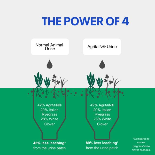 AgritaiN® combines four modes of action that work together to significantly reduce nitrate leaching from the urine patch up to 89% depending on sward blend.