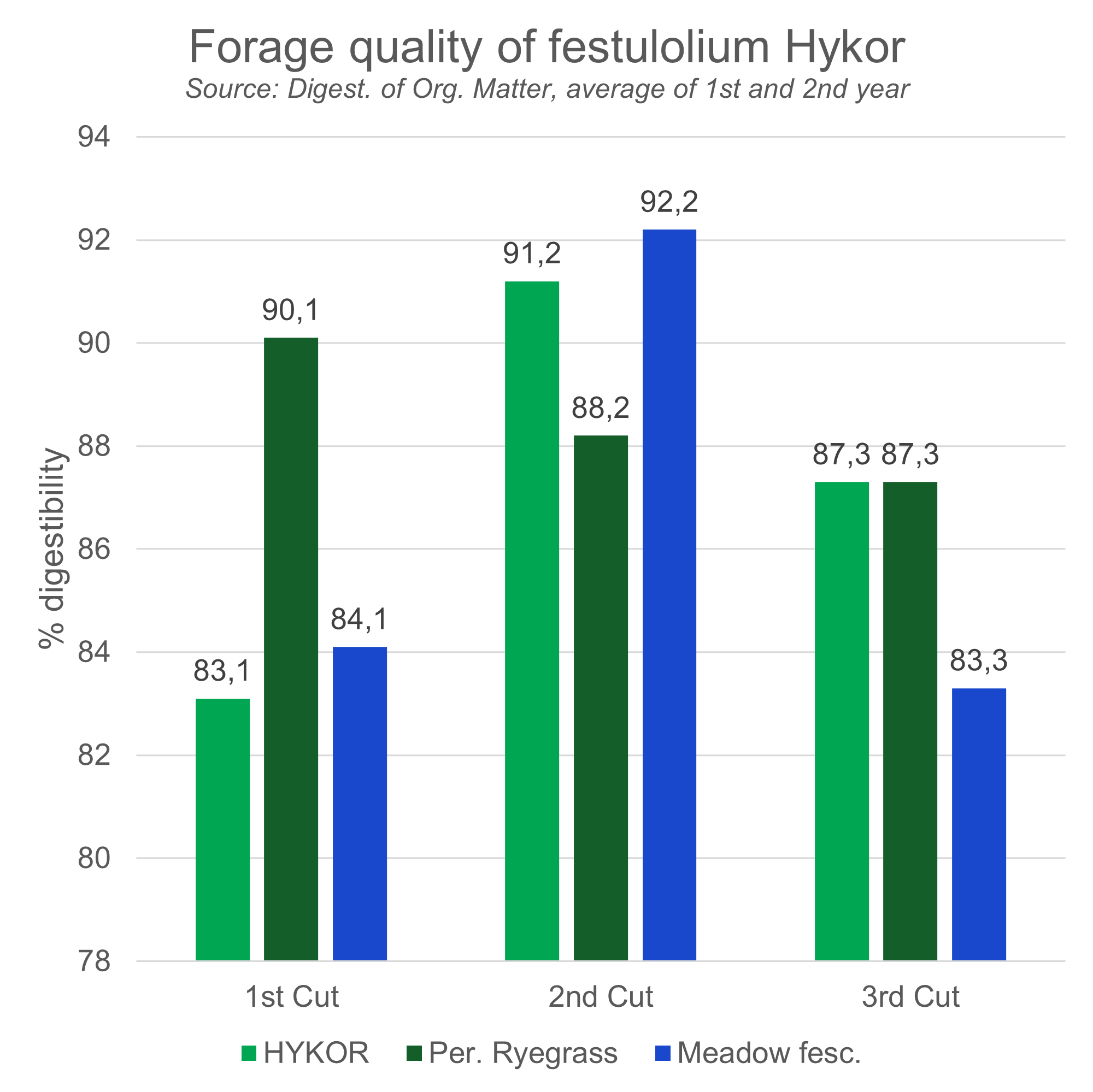 Main traits for HYKOR is high yield potential, persistence, drought resistance and tolerance to high level of subsoil water. HYKOR can be used as substitute for meadow fescue with markedly higher yield as result. Compared to meadow fescue and tall fescue, festulolium varieties like HYKOR have better feeding value – measured by higher content of sugar and energy.