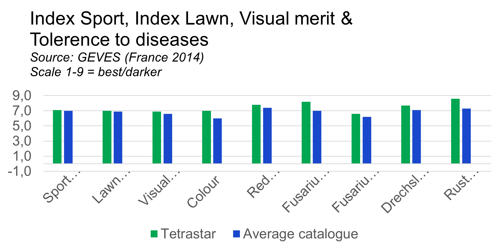 Index Sport, Index Lawn, Visual merit & Tolerance to diseasesSource: GEVES (France 2014), 1-9 = best/darker |