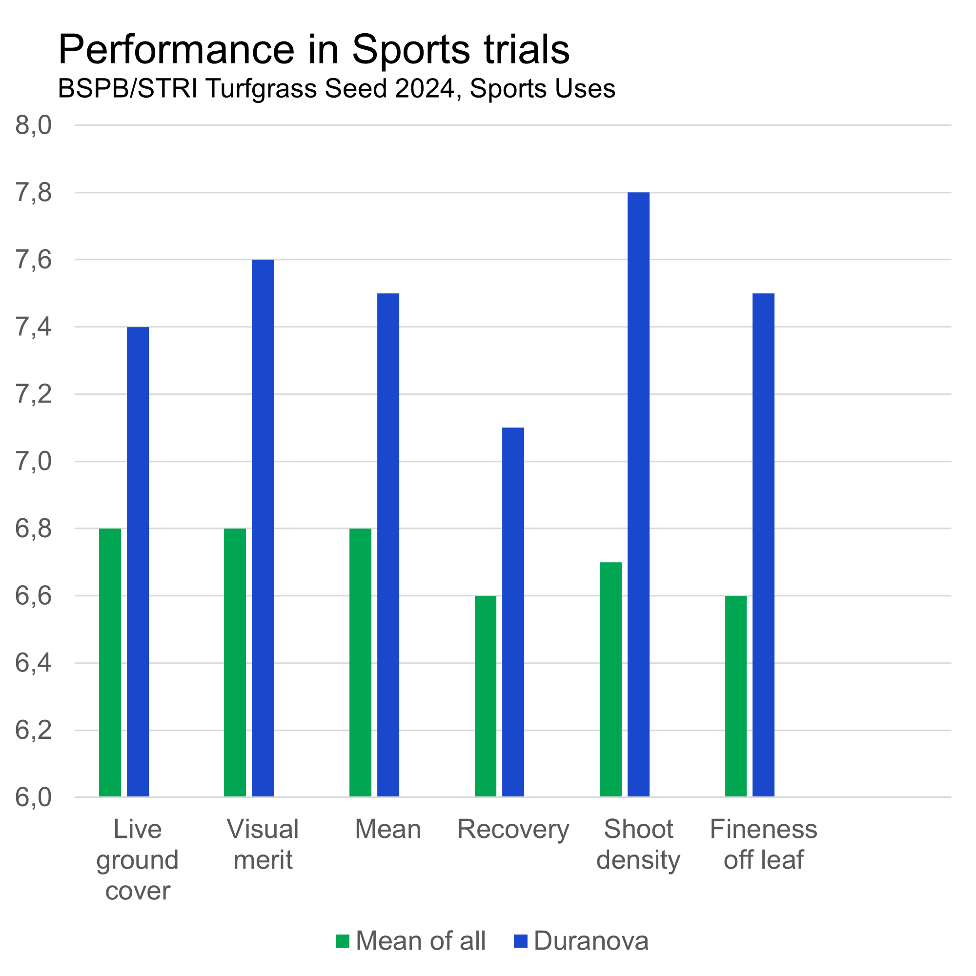 BSPB/STRI Turfgrass Seed 2024, Lawns, Landscaping, Summer Sports and Turf Trials| Cultivar | Mean of All | Duranova |