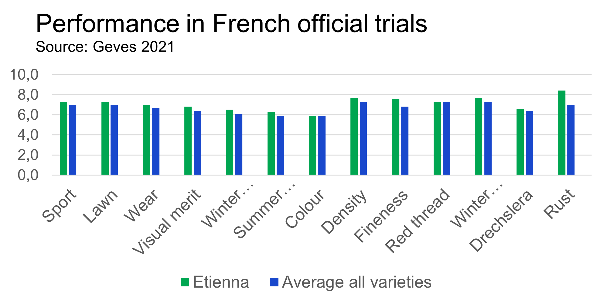 ETIENNA has shown excellent rust and red thread tolerance. Obviously, it contributes to better visual merit, increases persistency and the strengths needed to perform, e.g. wear tolerance. Savings on fungicides and time/cost of maintenance.