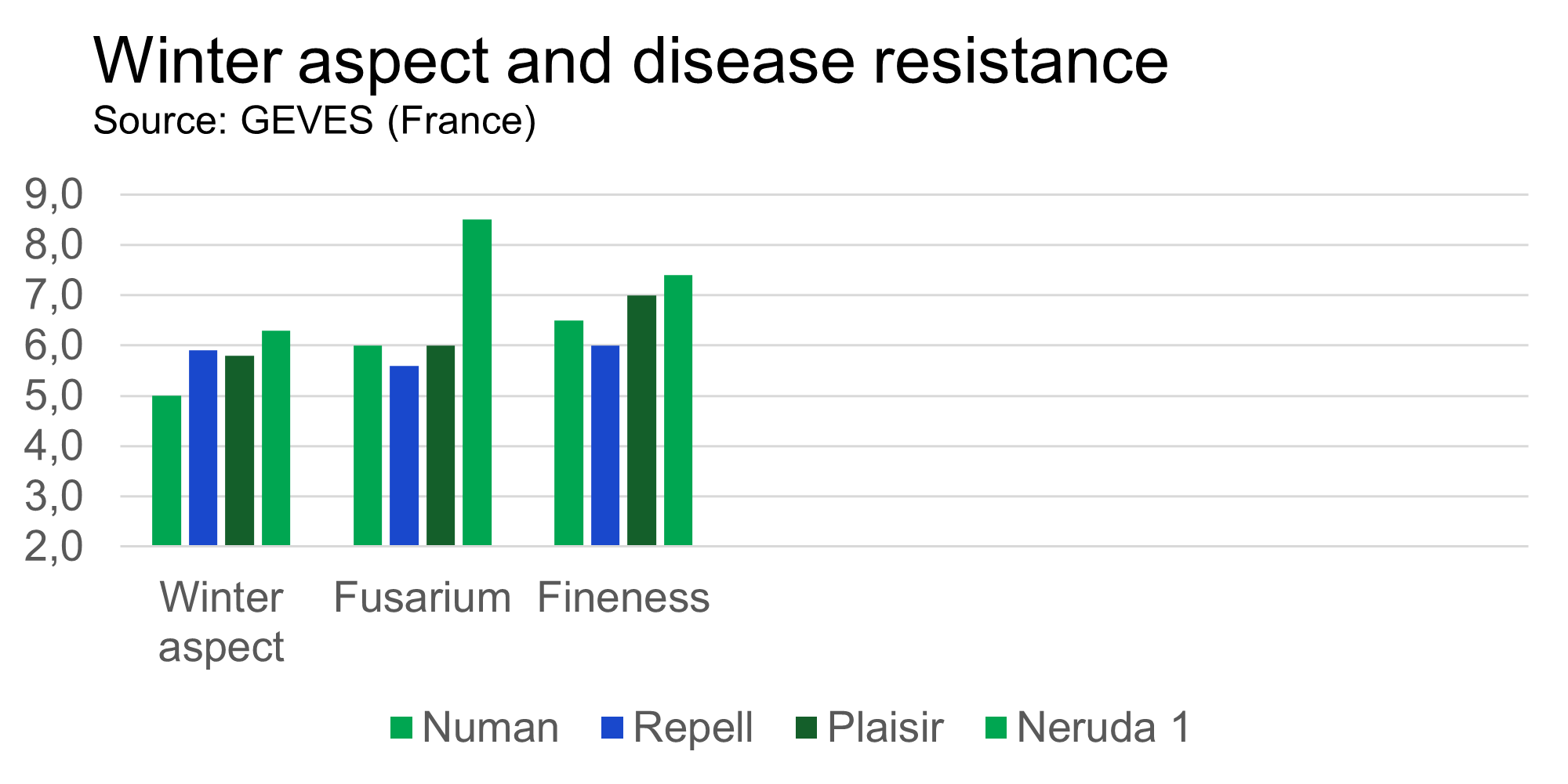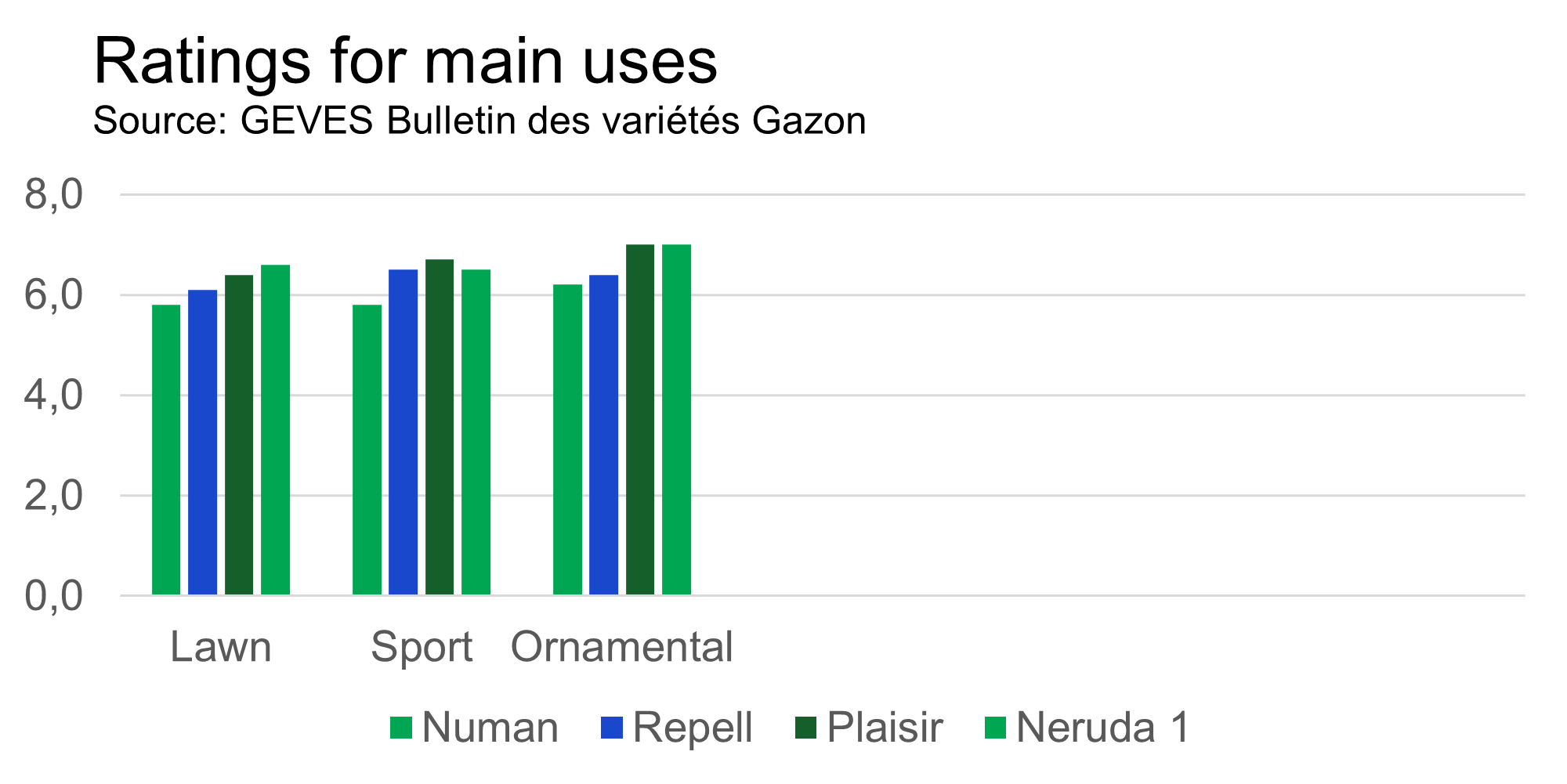 Source: GEVES Bulletin des variétés Gazon| Numan | Repell | Plaisir | Neruda 1 | |