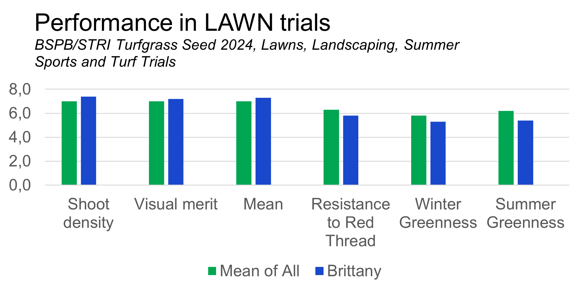 BSPB/STRI Turfgrass Seed 2024, Lawns, Landscaping, Summer Sports and Turf Trials| Mean of All | Brittany | |