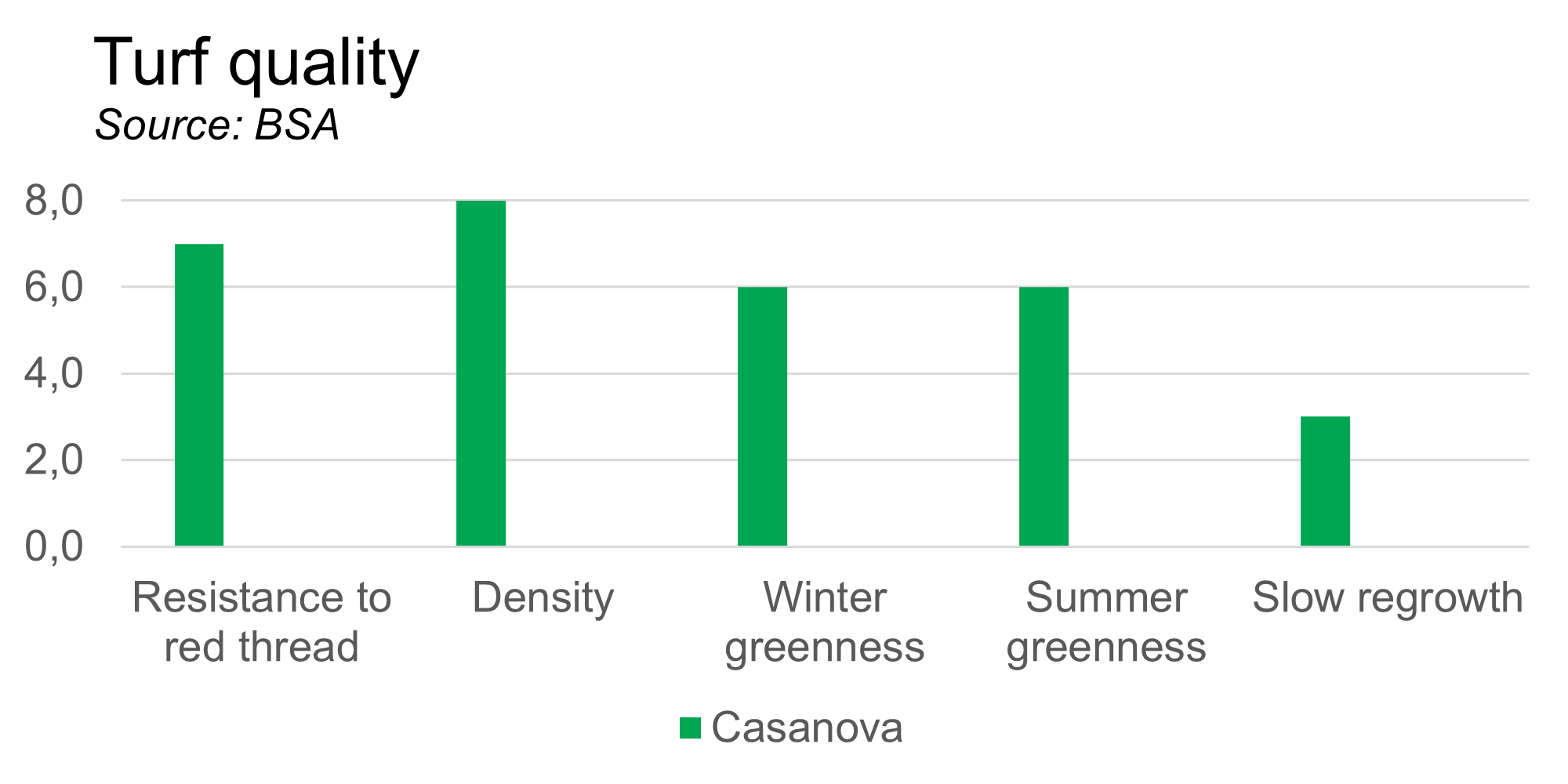 Casanova creates a very dense turf with a nice and stable middle green appearance all over the year. There is not much difference between the winter and the summer appearance of Casanova. It has quite a good disease resistance against the major lawn diseases.