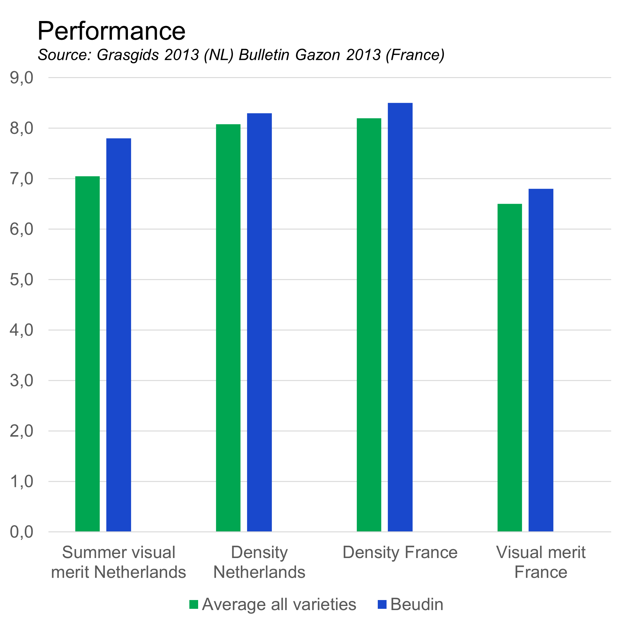 BEUDIN is one of those varieties performing well wherever they are planted. The French national list and the recommended lists in The Netherlands (Grasgids) and in the UK (STRI) all recognizes the high performance of BEUDIN.