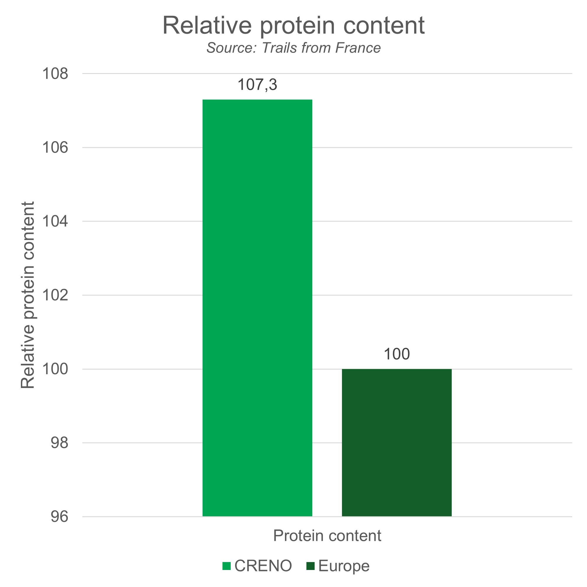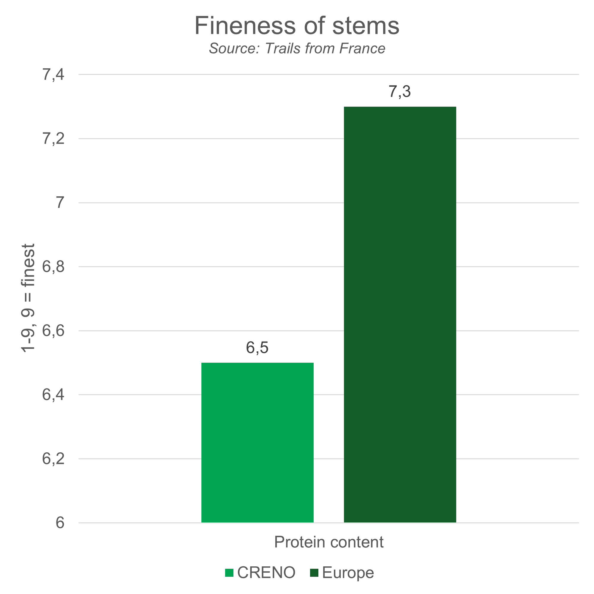 Compared to the standard variety Europe, CRENO shows higher protein content, finer stems and better Verticillium resistance. For Verticillium the score of CRENO is 1,09 with 1,57 for Europe (1=resistant).