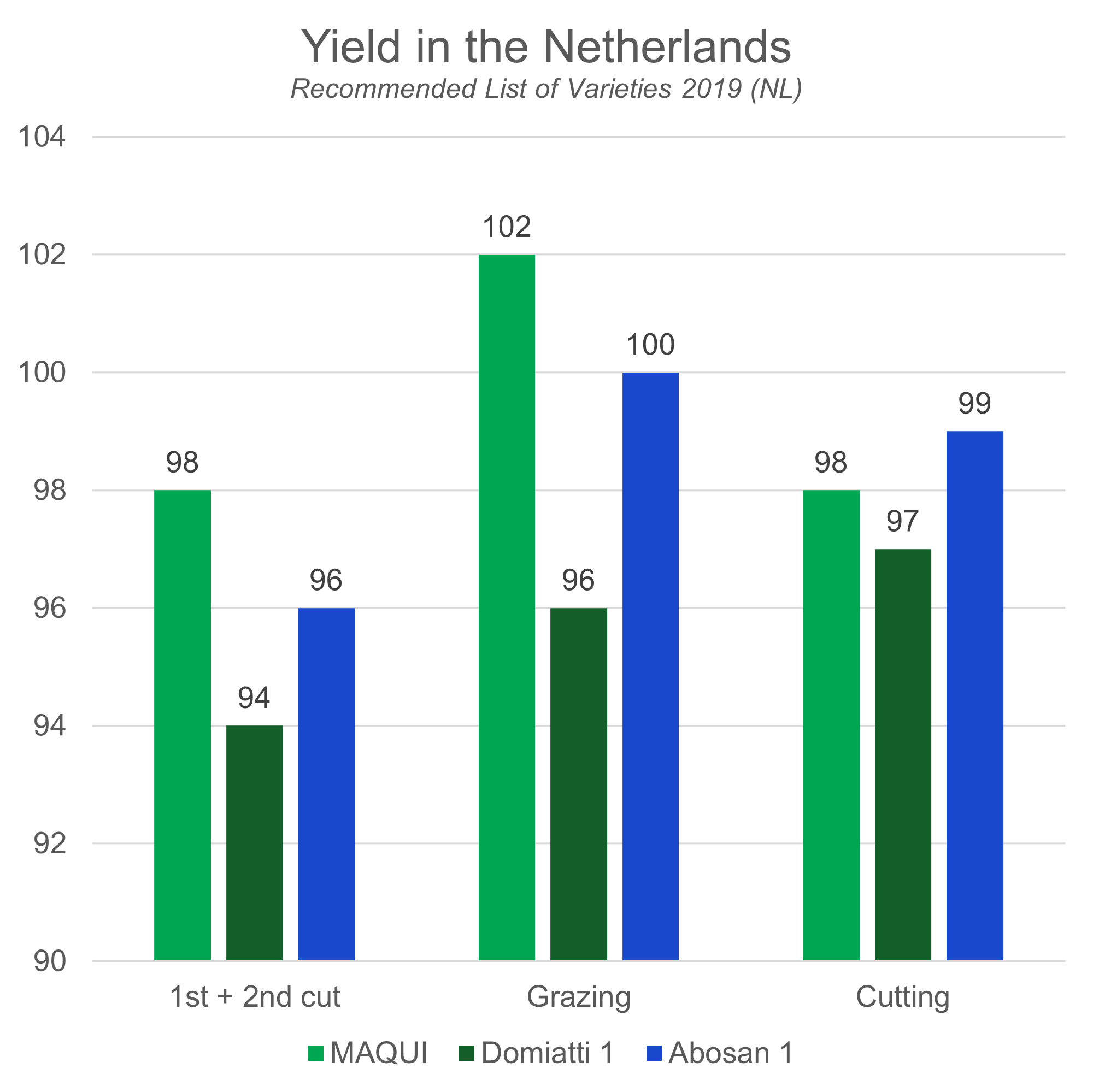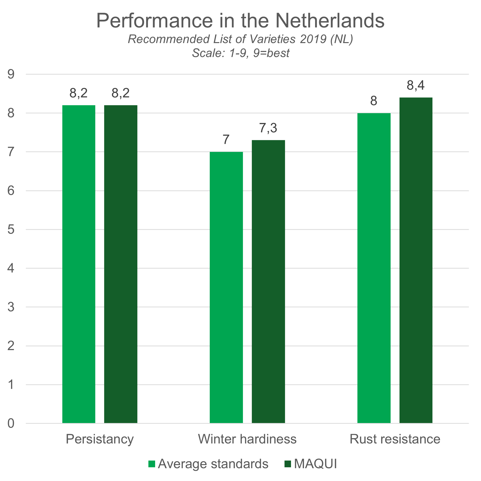 MAQUI has a top rust resistance on the recommended list in the Netherlands. In addition, it shows a high persistence. This combination of high disease resistance, high persistency and good yield in the second cut is unprecedented in the Netherlands.