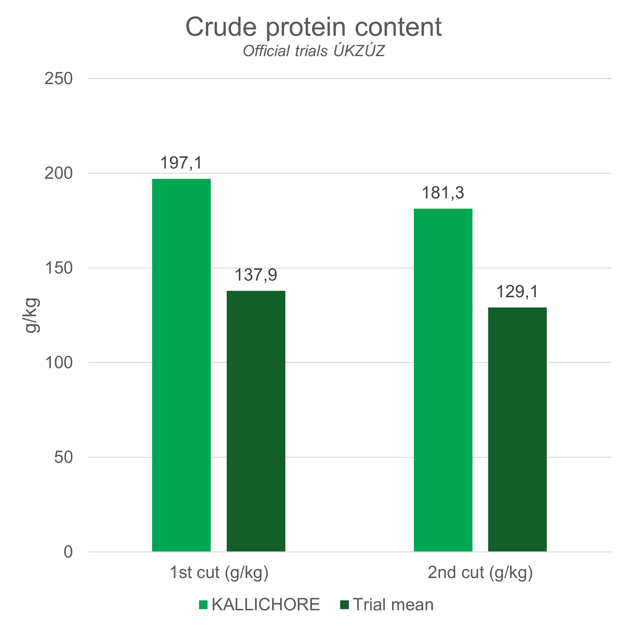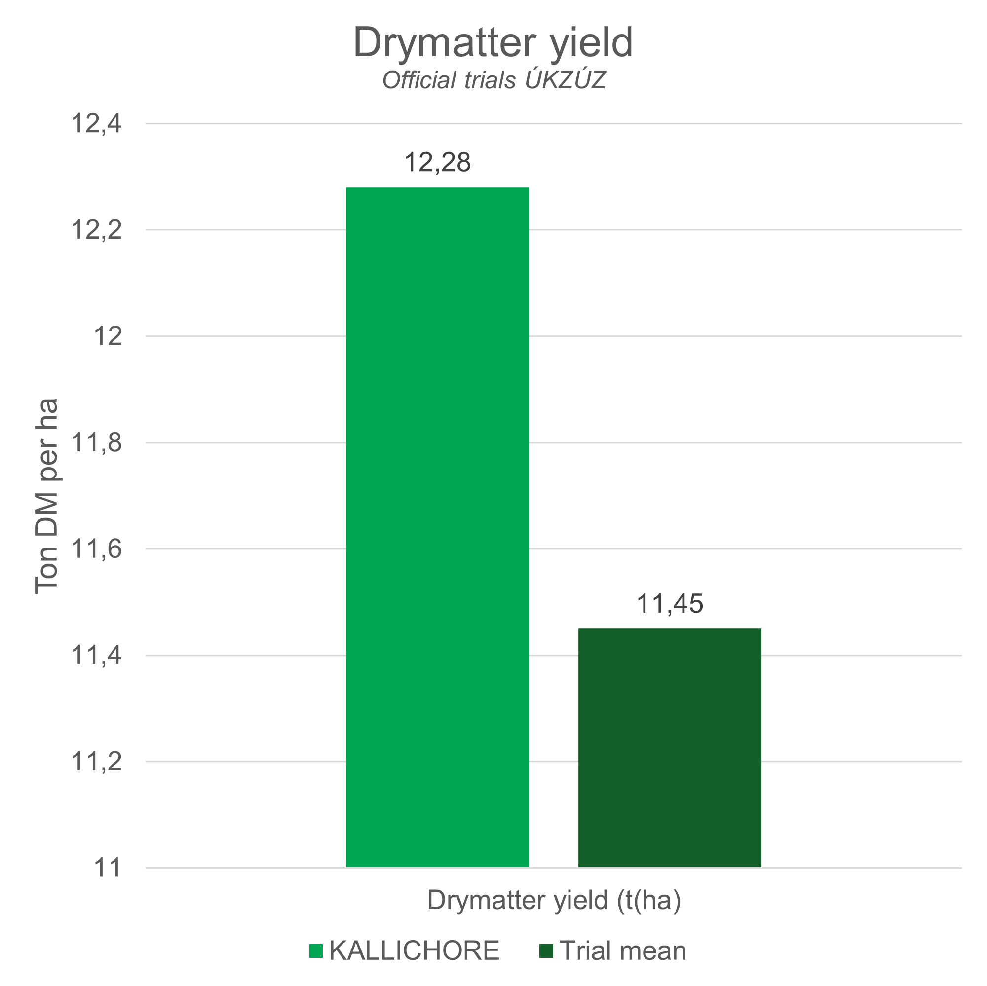 Choosing Kallichore for your fields means securing high dry matter yields of quality forage for longer in comparison with other red clovers. From official trials done by ÚKZÚZ, Kallichore yields nearly 1 ton/hectare extra in dry matter yield when harvesting in 2nd year!
