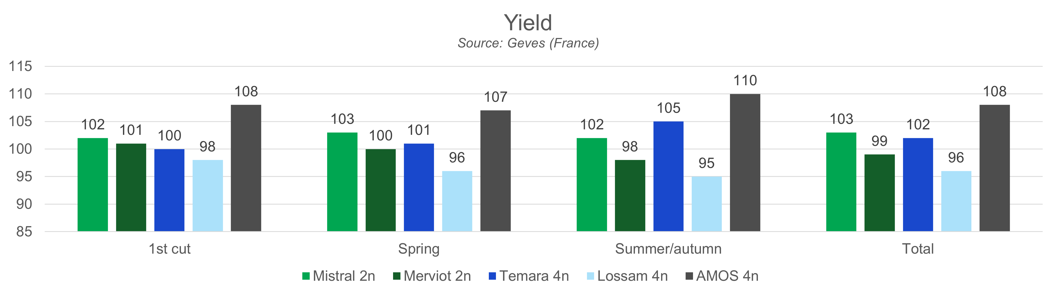 In both the official German and French trials AMOS has out-yielded other varieties, showing stable and very high yields in green- and dry matter. Tetraploid varieties are more vigorously growing and AMOS is outstanding.