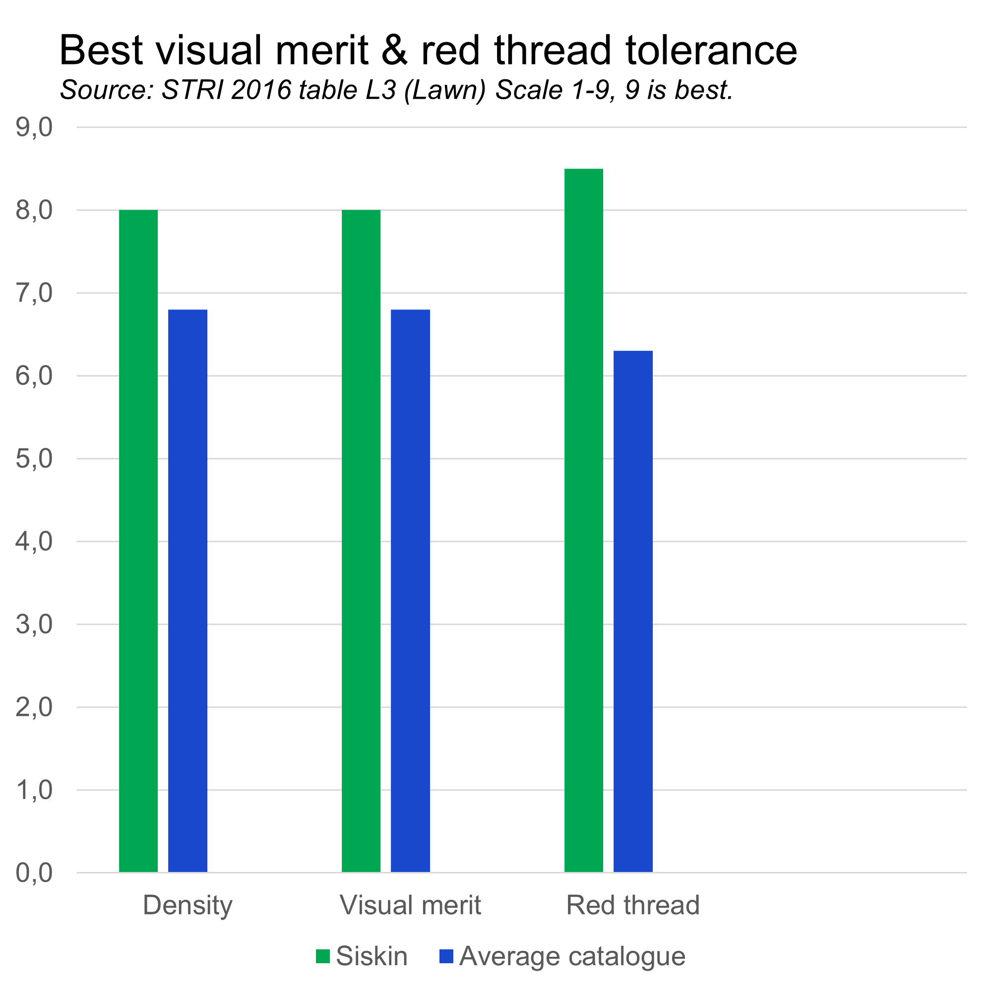 Differences are rarely so exceptional as for the Siskin red thread score on the STRI list. 0.7 higher than number two is an exceptional advantage. Siskin has excellent visual merit even with very low inputs.